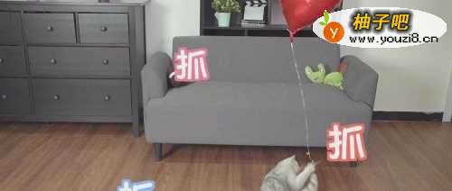在气球另一端绑上承重物和羽毛,放在屋里让猫咪自嗨就好