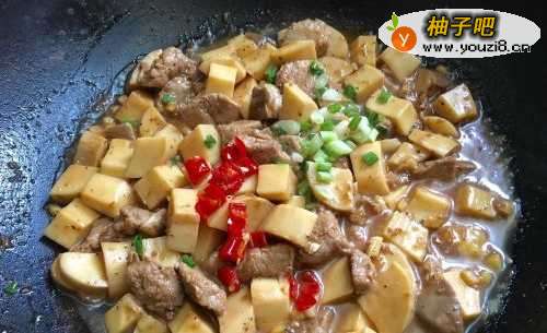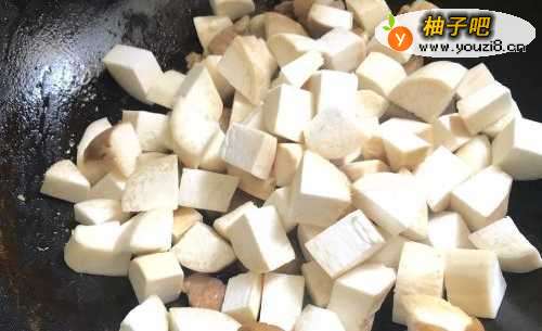 4牛里脊肉丁炒好后把切好的杏鲍菇倒进去大火翻炒,过程中可以加入1勺酱油!