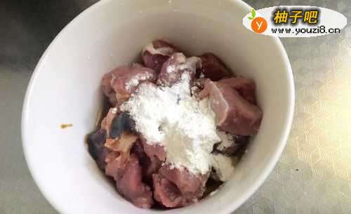 首先把牛里脊切成正方形的小肉丁,放在碗里,分别加入一勺料酒一勺酱油一大勺淀粉抓匀,腌渍一会!