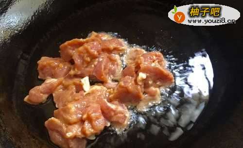 3接下来开火,锅烧热之后加入适量油,油热了把腌好的牛里脊倒进去翻炒,翻炒至牛肉变色厚加入姜蒜末煸香。