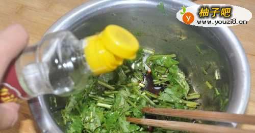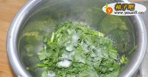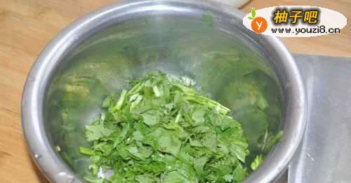 2然后拿一个拌菜的盆,放入一些香菜在里面