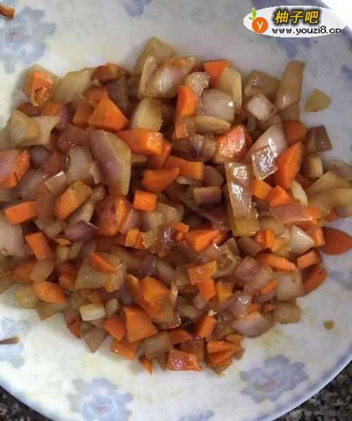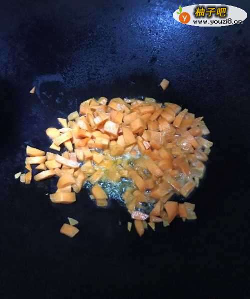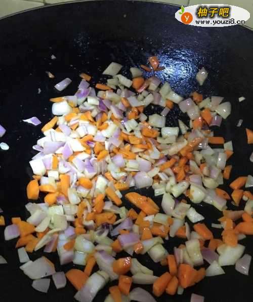 3锅里烧热,放入油,倒入胡萝卜翻炒均匀,加入适量的盐。然后把洋葱倒进去,继续翻炒均匀。