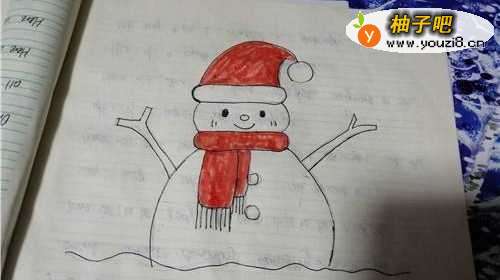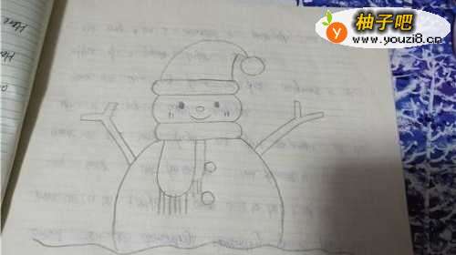 6我们再把雪人身子的两侧画出两根树枝,最后用彩铅上色就完成了。