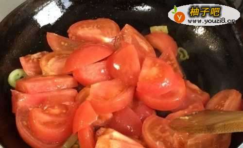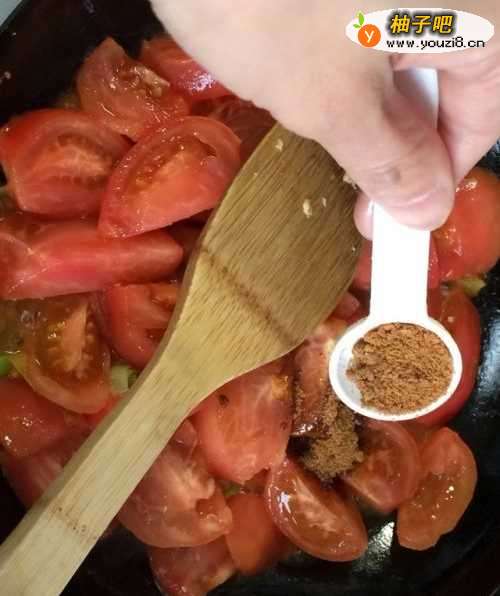 12按糖,3g盐的顺序放入调料,还是温柔的翻炒几下,不要翻太多,以免番茄都烂了不美观。