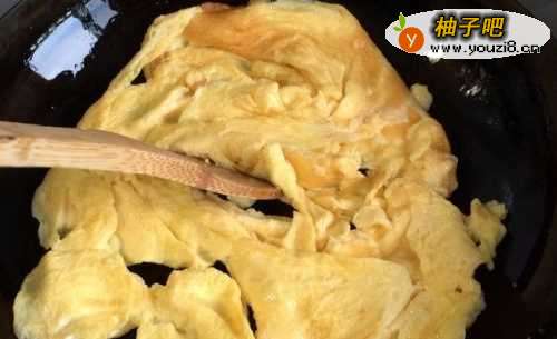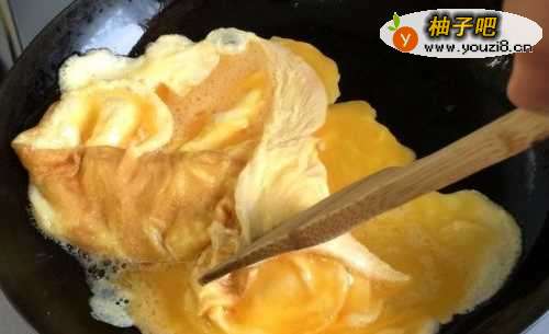 8鸡蛋很蓬松吧。这时候把它简单用铲子分几块。