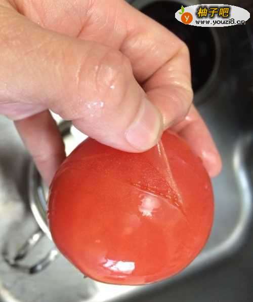番茄用热水烫30秒钟,冷水冲后去皮。