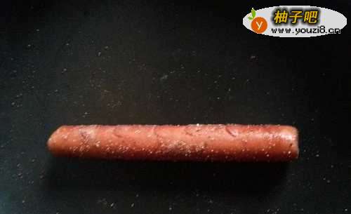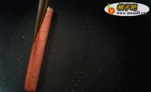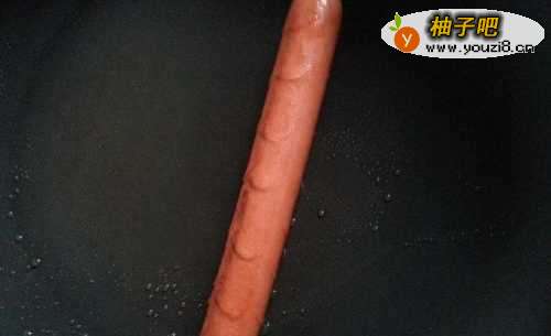 4将火腿肠放入锅中小火煎,要不停转动火腿肠