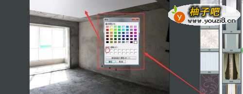 7软件右下角有RGB调色盘,鼠标右击即可弹出,选取颜色使用,如图中将吊顶涂为白色。软件右侧有各种装饰素材(墙纸墙布、窗帘、家具、灯饰、门窗等等),也可拍装饰产品照片自行添加入软件中使用;