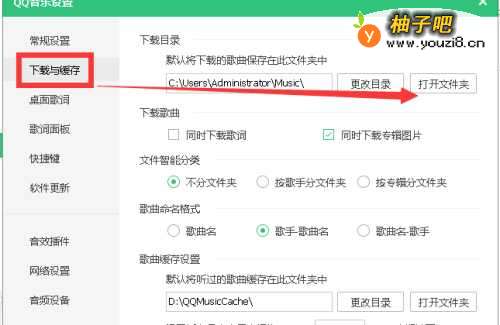 5然后点击左边的“下载与缓存”,然后点击“打开文件夹”,如图所示