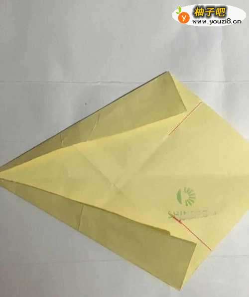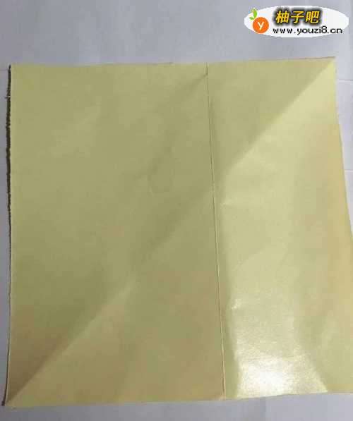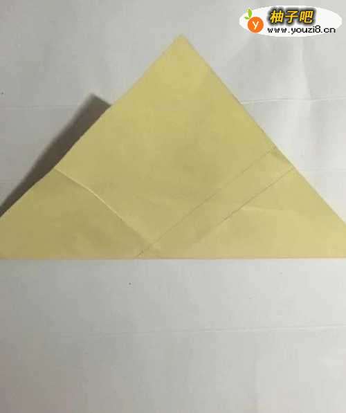 第一步 把一张16厘米的正方形黄色彩纸 从下向上对角折叠后取开平放 然后从下向上折 只需右边一少部分折出折痕 再从左向右折叠 至需上头一小部分折出折痕后取开
