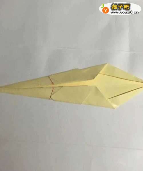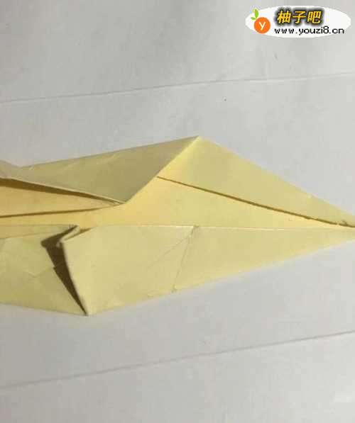 4第四步 折叠完之后 拿起左边部分的下角 向上折至中线 同时向左挤折出一个小双三角折倒 然后上边同样操作 再挤折出一个小双三角折倒 作为恐龙的腿部