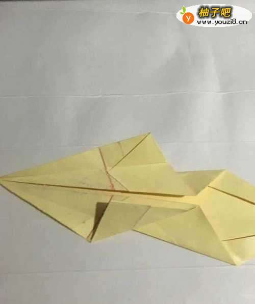 5第五步 折叠完之后 再拿起下边的微角向上折叠至中线 同时向左挤折出一个小双三角 上边同样折叠挤出