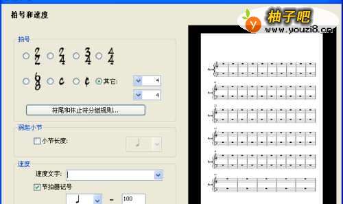 4选定好版面,就到了拍号、弱起小节、速度、音乐表情术语的设置了。