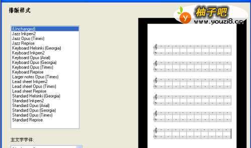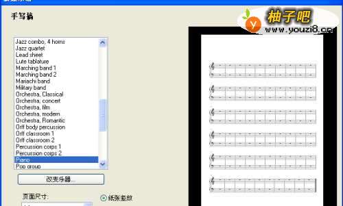 左边框是谱面类型的选择,下面还有页面尺寸、纸张横竖放的选择,至于“改变乐器”,这个不要理它,不然……你就知错了……(具体后果一两句说不清,这里就不赘述了。)