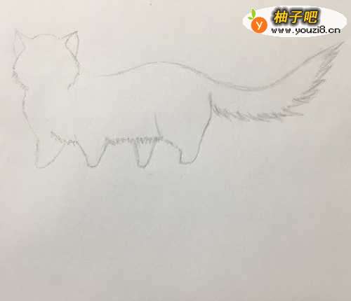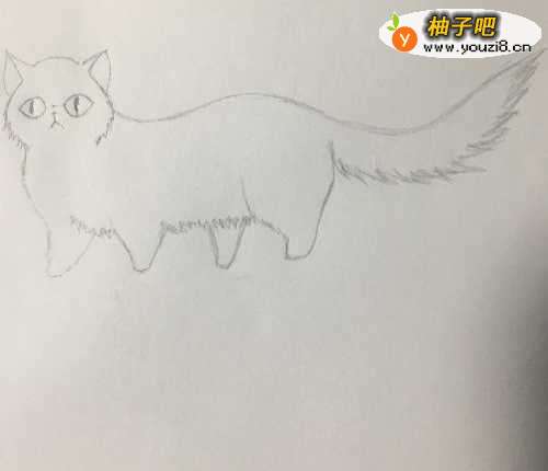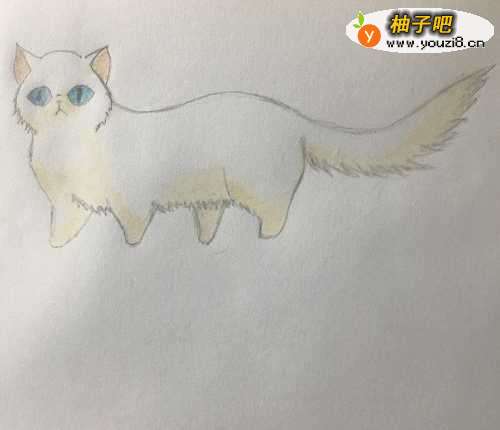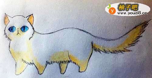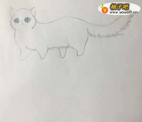 3然后画出蓝眼白猫胖胖的尾巴,挂在屁股上面。