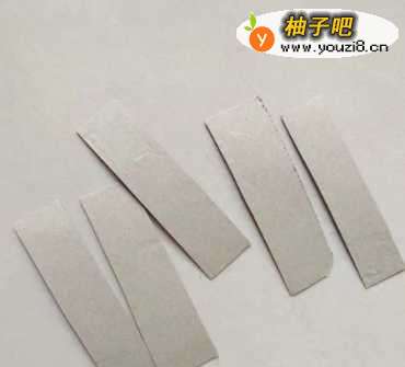 3用剪下来的纸箱盖子,剪成比纸箱的宽要短3厘米的长条。剪5个这样的长条就可以了。