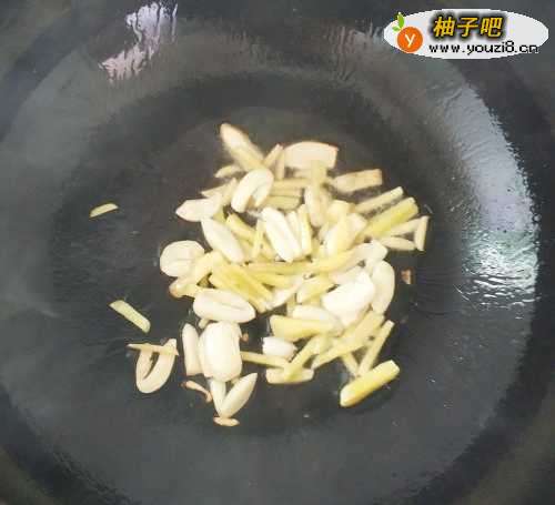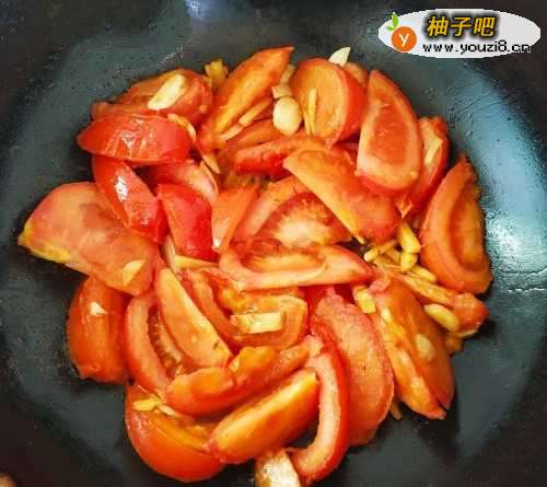 3热锅,倒入适量食用油,然后放入姜丝和蒜片爆香,再放入切好的西红柿翻炒。不要翻炒过勤,不然容易把西红柿搅拌不成形了。