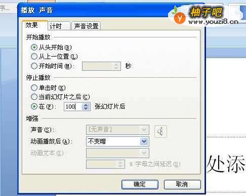 5进入效果设置界面,可以设置开始播放的位置,和结束播放的位置,默认是单击时,就是进入下一个ppt时。如果想要全程播放该音乐的话,可以设置为在ppt所有页数之后,关闭音乐,比如100