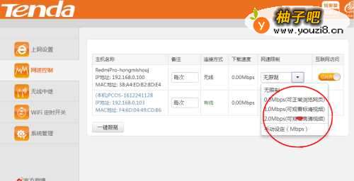 3点击,左边第二个,网速控制,你会看到如下画面,所有联网的手机或者电脑都会显示在页面上,在我的这张图上可以看到本机就是电脑是连接的,另外还有一台红米也是联机的,然后在后面可以点击禁用