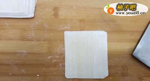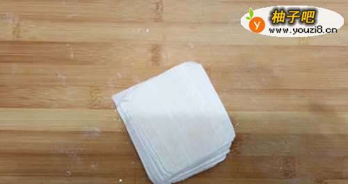 2然后,将云吞皮两张或三张叠在一起,用刀在划三刀;