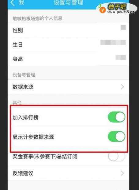 6进入设置管理的页面,我们点击关闭【加入排行榜】和【显示计步数据来源】这两个功能按钮。