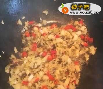 3锅里热油,油比平常炒菜要多一些因为酸菜吃油,放入小红辣椒、酸菜和芽菜翻炒至香。