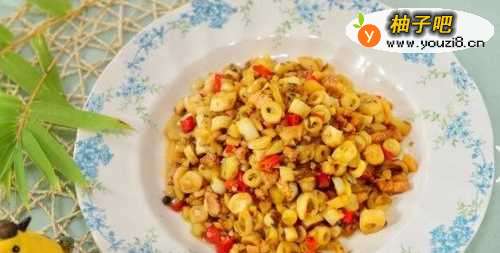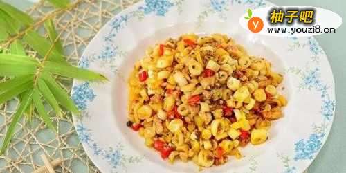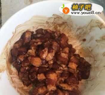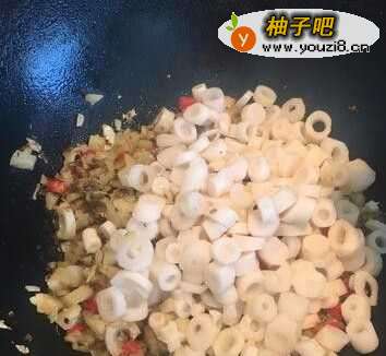 5放入肉丁炒熟,放鸡精、再淋少许油出锅。