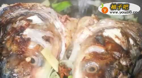 6鱼头入锅,倒水1000ml,放入切好的葱、姜、八角