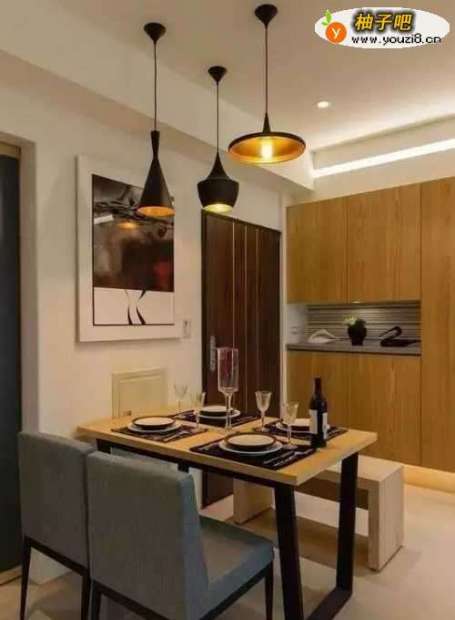 与客厅同样色彩的鞋柜,采用简洁的门板造型,让整体感觉一致性很好。配上同样风格的餐桌,两用的换鞋凳,这样的设计不但至简,也很实用。对于小公寓,三口之家,非常适合。
