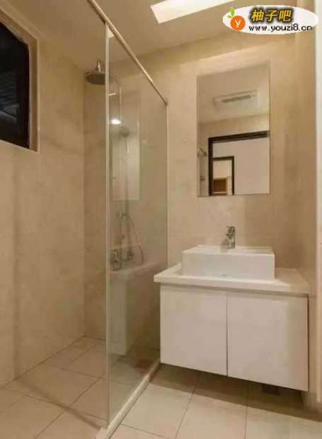 卫室柜的简洁造型与纯白的色彩加上镜子的方正,让人感觉整洁大方。一字型淋浴门让干湿分离,加上墙体掏出来的方格,让整个空间实用而美观。黄色的磁砖,让白色更白,让简约更添美感。