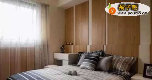 床头北景用木饰面,算是比较新颖的理念。特别是留缝和小平台的细节处理,让整个设计显得简约、实用而又灵动。