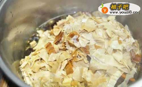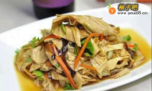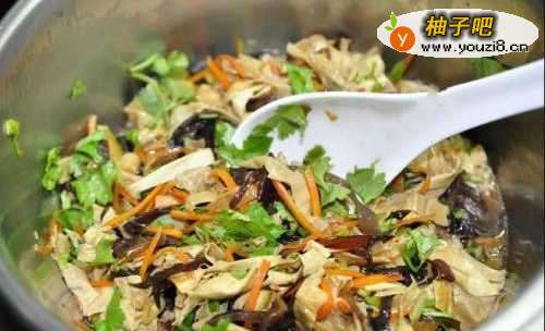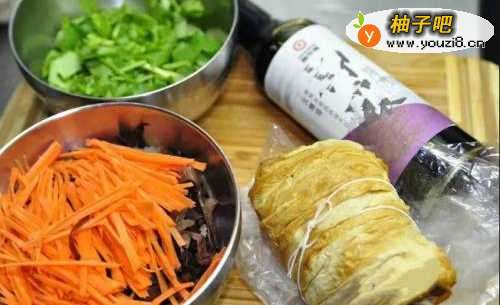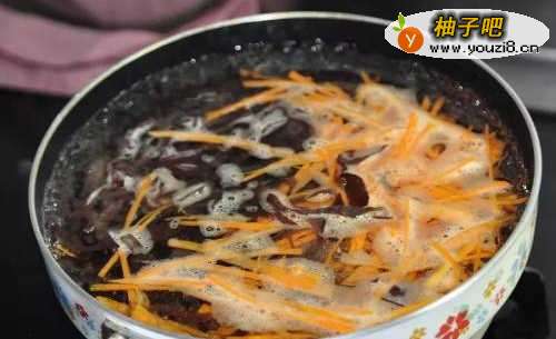2煮滚一锅水,加入胡萝丝和木耳氽烫1分钟,捞起后熄火放入豆皮过一下热水即可捞起