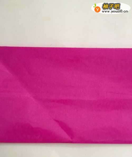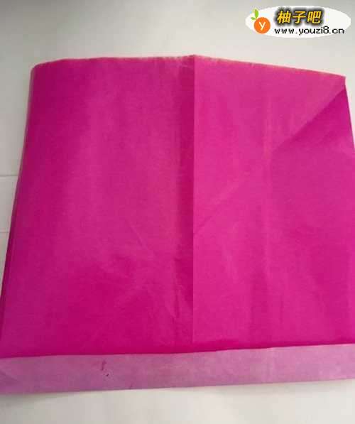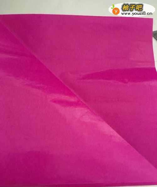 第一步 把一张14厘米X14厘米的正方形二红色彩纸 从下向上对边折叠