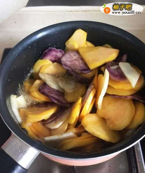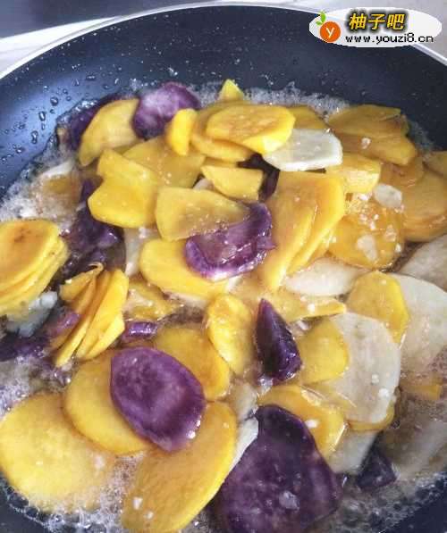 6待冰糖将要全部融化并逐渐开始粘稠的时候可以倒入炸好的番薯片进行翻炒;