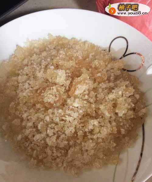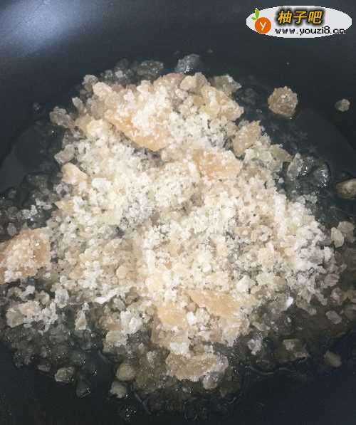 5捞起沥干油后,锅里放少量油,倒入准备好的冰糖进行翻炒,俗称炒糖;