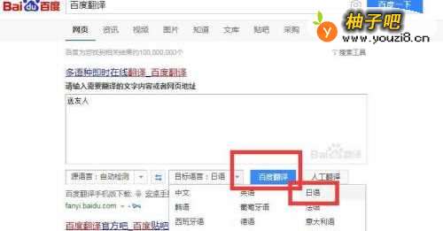 5然后点击“目标语言”,选择“日语”,接着点击“百度翻译”,如图