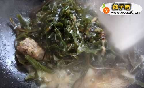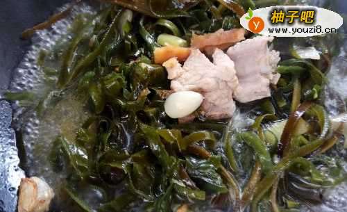 3葱姜蒜炸微黄后,放焯好的海带丝,翻炒均匀后,放适量的盐,然后放1大碗排骨汤。(排骨汤事先炖好)