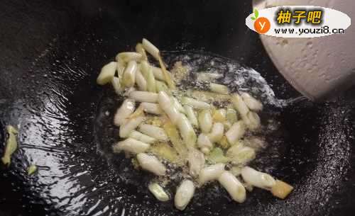 2将葱、蒜剥好,洗干净,将葱切成斜段、蒜切成小瓣;将姜洗干净,切成片。将炒锅中放入适量的油,开火,待油微热,将切好的葱姜蒜放入锅中。