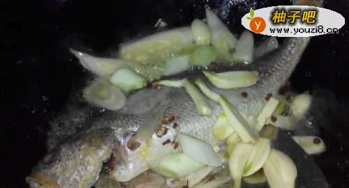 4放入葱花、大蒜和花椒,炒至有香味,让佐料的香味进入鱼肉里。