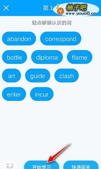进入到第1关的词汇画面,我们可以选择单词学习也可以直接闯关,例如选择相应的单词进行学习。