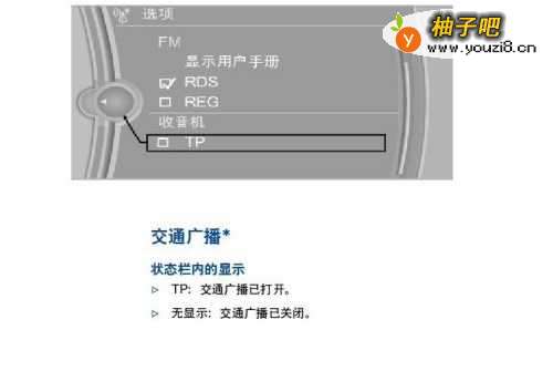 3打开或关闭广播:要想接听交通实况,可按压DVD播放器按钮,然后就会接收信号最强的交通广播,接着通过IDrive调出选项——选择TP。要想关闭交通广播公告或按下TP键。