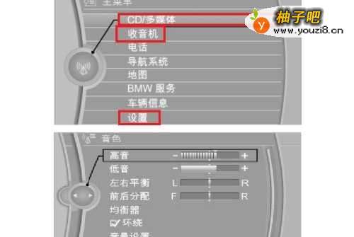 6音色的设置:先在主菜单那选择“CD/多媒体”,“收音机”或“设置”——“音色”——然后就可设置高低音、左右平衡、前后分配、均衡器、环绕和音量设置这几项。