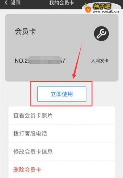 6进来之后会显示卡片的基本信息,我们点击“立即使用”,会跳转到会员码页面,系统会使用卡号自动生成一张二维码及一张条形码,然后可以将此码出示给商家扫描即可。