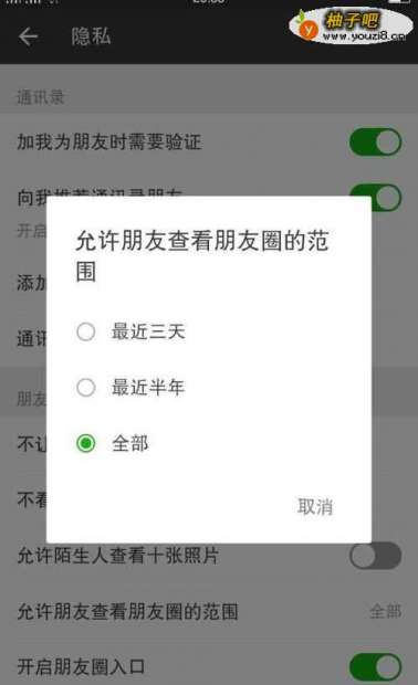 55.点击“隐私”页面的“允许朋友查看朋友圈的范围”,这里可以设置为“最近三天、最近半年、全部”,不想被,别人看到自己所发的说说,就可以点击“最近三天”按钮进行设置了。
