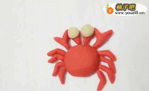 7再用两块黑色,团成小球,粘在白色的眼睛上面,当眼珠,这个螃蟹就做完了。