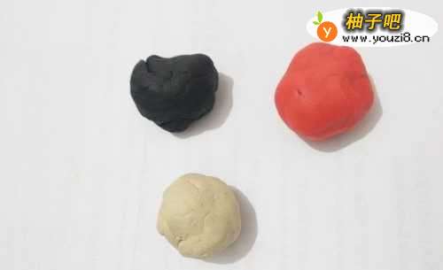 6用两块白色团成球,再按成扁片,粘在托上,当眼睛。