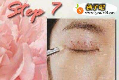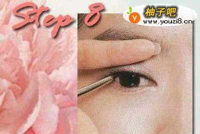 7Step 7 眼妆让眼睛看起来更加的深邃但又非常的自然,就要选择浅棕色的眼影,在靠近睫毛的地方,由睫毛根部向眼睑中间这个方向一点点涂刷,打造深邃眼妆的效果。
