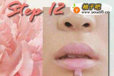 12Step 12 唇妆选择粉杏色的唇膏来涂刷嘴唇,一定要在唇线以内的范围。