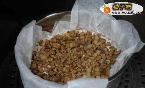 4再把肉燥舖在芋头丝上,蒸大概40-50分钟