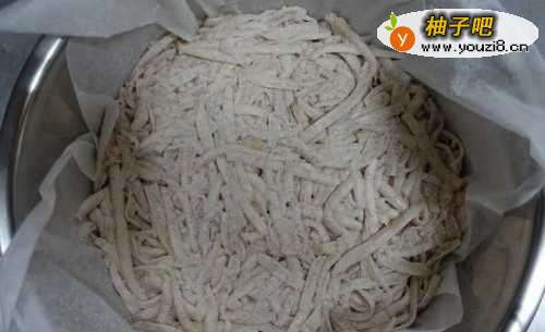 2这次用的是直径19公分的圆锅,裡面铺烘焙纸,把做法1.平铺上去